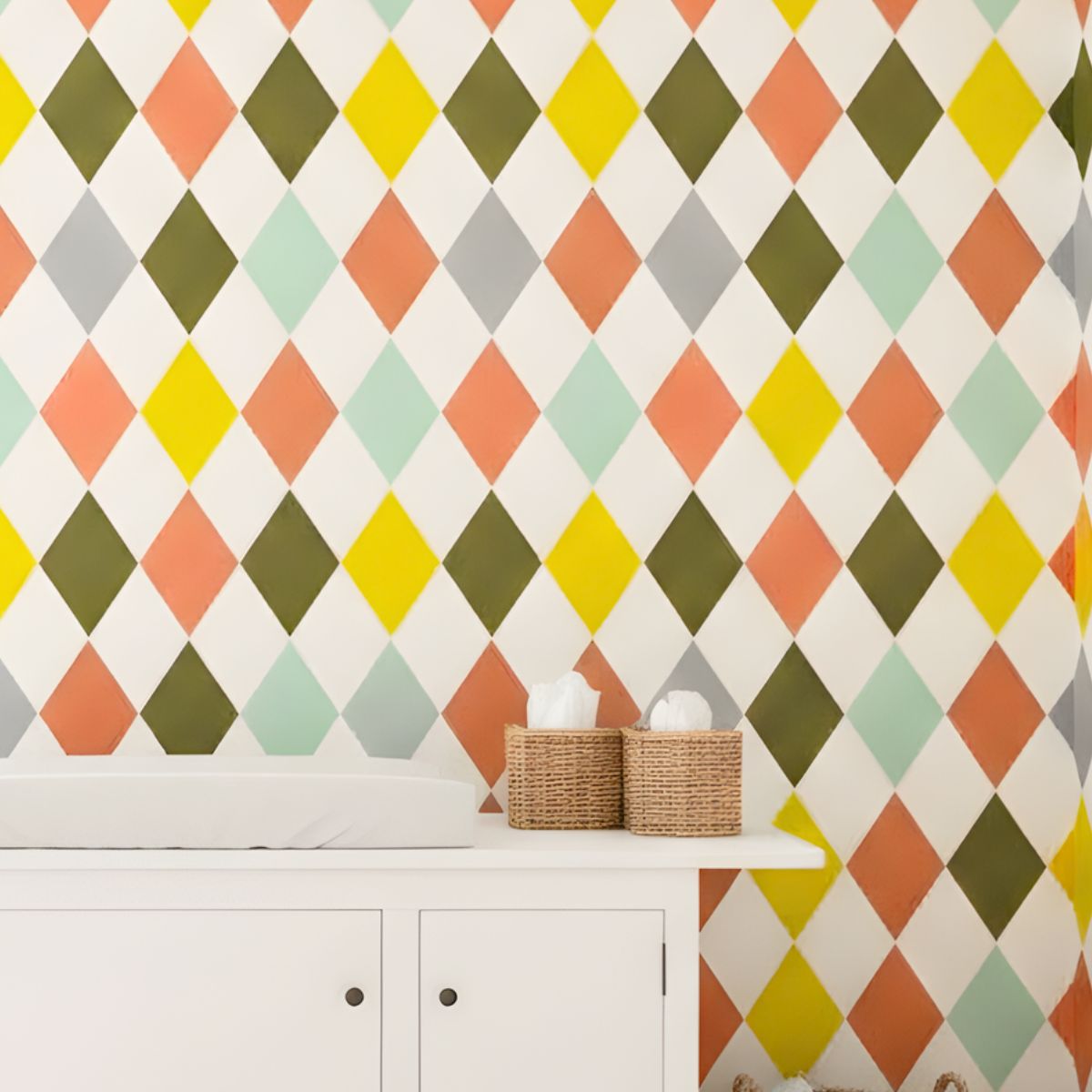 Cores principais: Amarelo mostarda, Verde menta, Terracota (ou salmão), Cinza e Verde oliva.