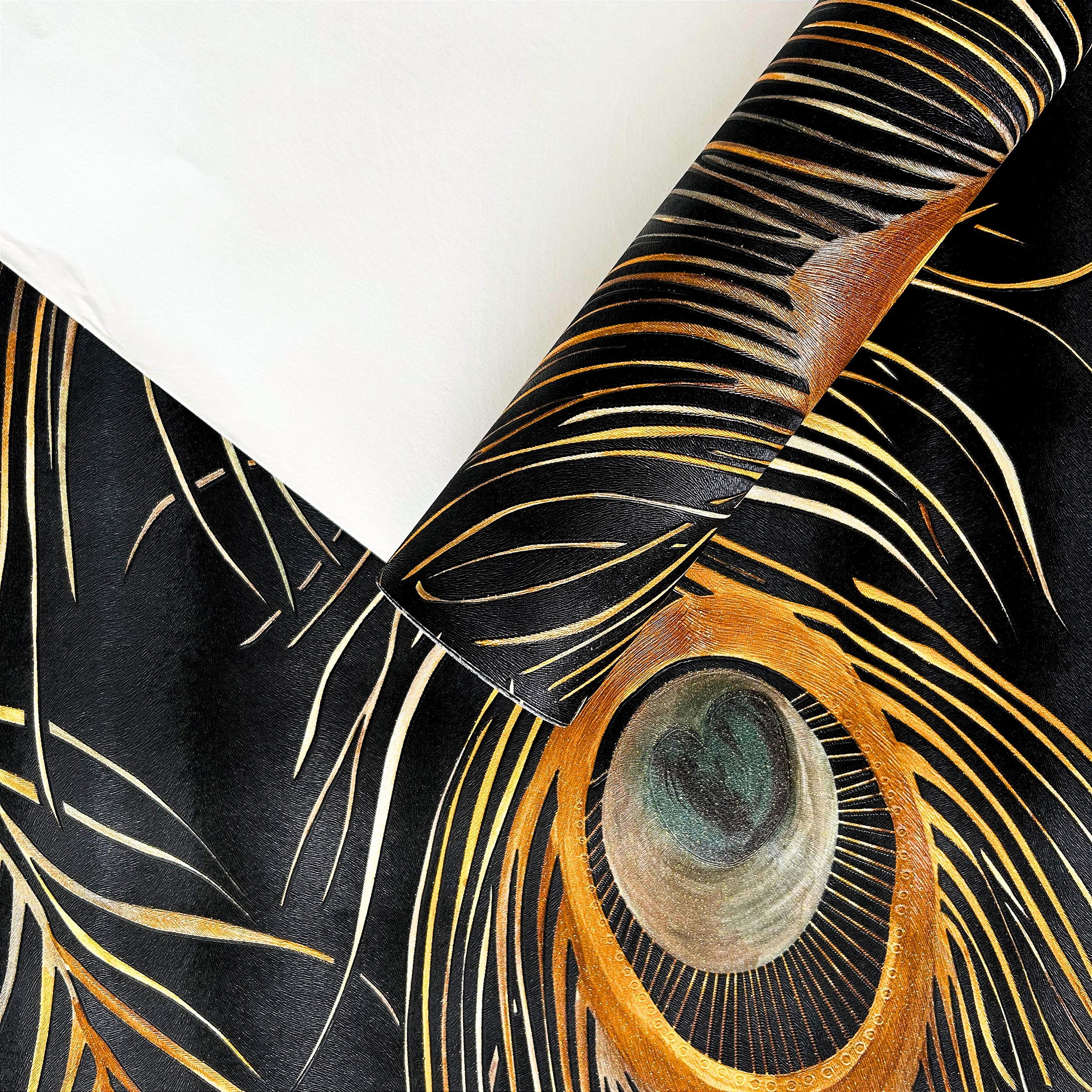 Papel de parede sofisticado com estampa de penas de pavão, combinando tons escuros com detalhes em dourado e toques de verde e azul. Um modelo elegante que traz profundidade, brilho e personalidade ao ambiente, ideal para quem busca um visual moderno e marcante sem abrir mão do requinte.